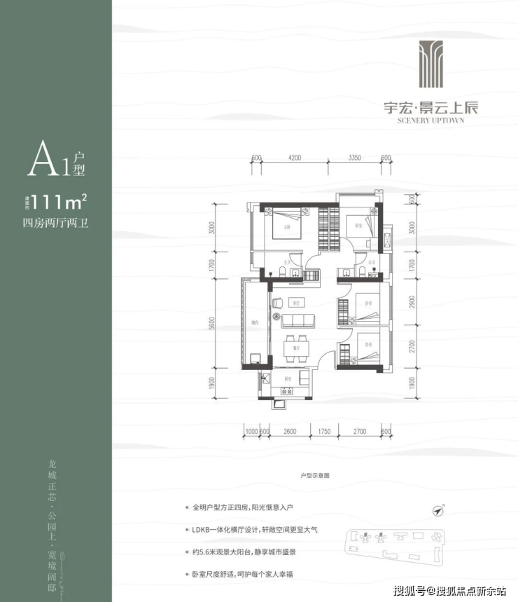 111㎡的4房2厅2卫,设计的是横厅南北通透格局,客餐厅5.6米开间,LDKB一体化,五开间朝南,4个卧室分别做到了3米/3米/2.9米/2.7米的宽度,客厅连接餐厅位出5.6米长的大阳台,L型厨房,公卫生三段式分离,得房率约76%(不含赠送),阳台主朝西南向。