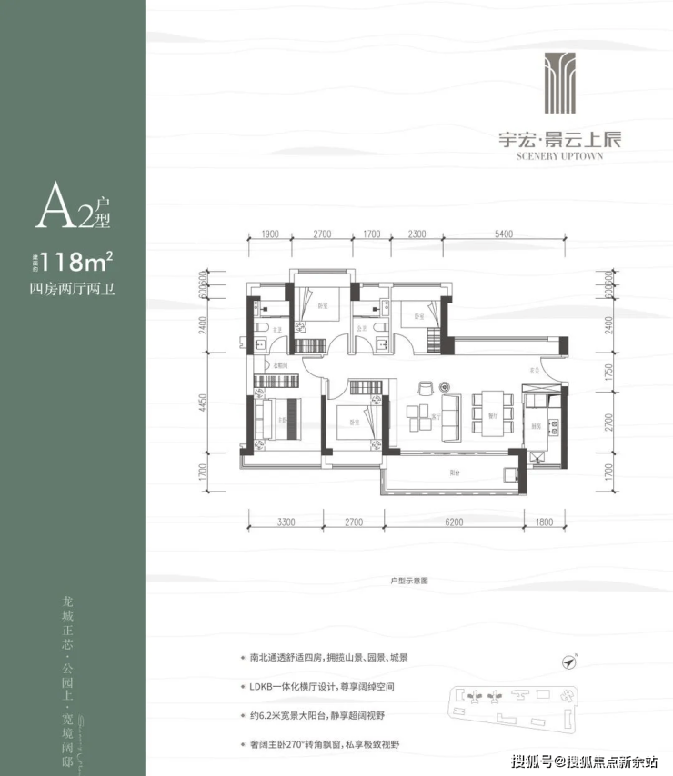 118㎡的4房2厅2卫,设计的是横厅南北通透格局,客餐厅6.2米开间,LDKB一体化,五开间朝南,西北面5.4米长的观景大飘窗,4个卧室分别做到了3.3米/2.7米/2.7米/2.3米的宽度,客厅连接餐厅位出6.2米长的大阳台,L型厨房,卫生间干湿分离,得房率约76%(不含赠送),东南朝向。