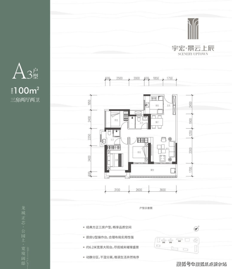 100㎡的3房2厅2卫,设计的是竖厅格局,客厅3.6米开间,LDKB一体化,三开间朝南,3个卧室分别做到了3.1米/2.6米/2.4米的宽度,客厅连接次卧出6.2米长的大阳台,U型厨房,卫生间干湿分离,得房率约76%(不含赠送),东南朝向。