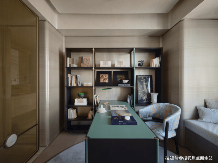 由餐厅踱步书房,动线开朗,纵深有度。柔韧纹理的透光玉石为空间增添温润的氛围,与端雅的青瓷器共同呈现现代和优雅的风格,给人宁谧的感觉。