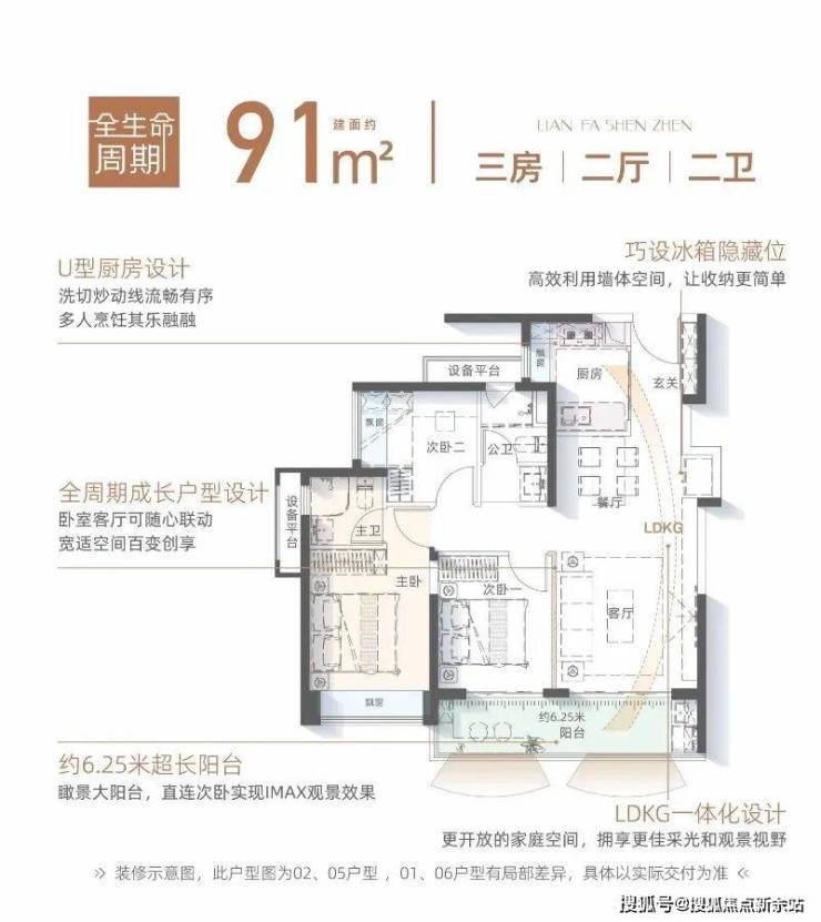 ③91㎡户型拥享约6.25米南向超长阳台,创变LDKG一体化设计,满足青年家庭成长需求