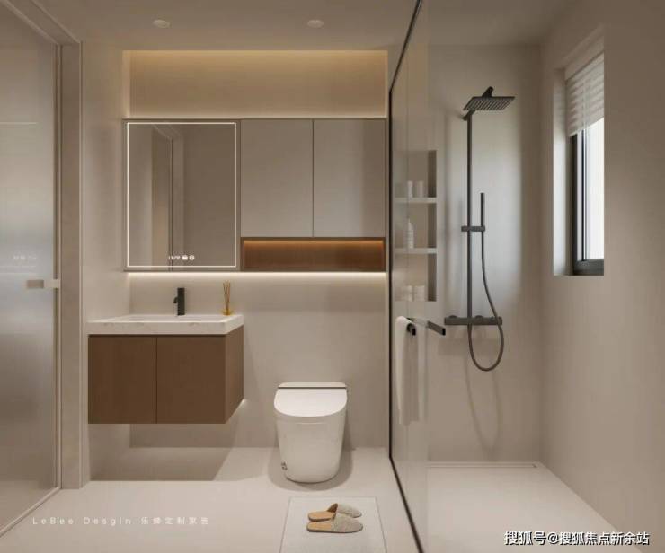 公卫干湿分离(玻璃隔断),米木色系搭配黑色五金。镜柜+壁柜保障收纳,镜灯+灯带营造层次光效。悬浮台盆、智能马桶,简约实用。