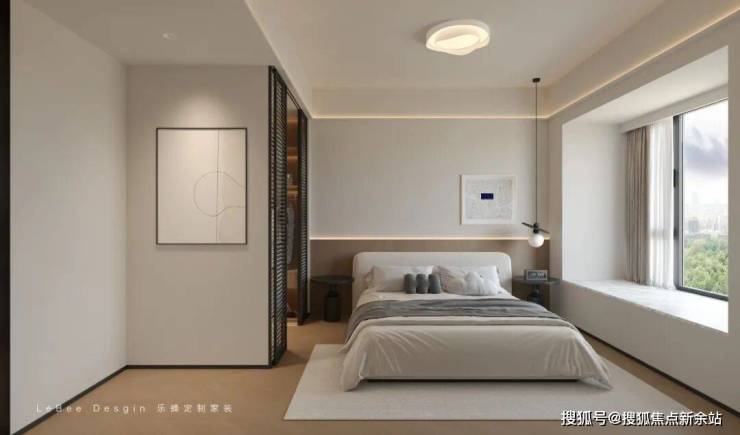 主卧以米白与浅木色为主调,轨门巧妙划分睡眠区与衣帽间,兼具通透感与分区;靠窗飘窗拓展休闲空间。
