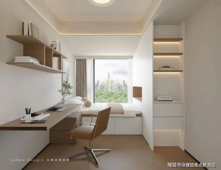 采用榻榻米+书桌一体化设计,巧妙整合睡眠、收纳(床下抽屉)与学习功能,上方开放架辅助置物,极致利用小空间。