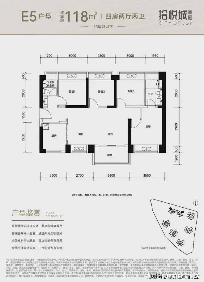 115平~118平全明采光户型,四卧室、厨房、两卫、客餐厅等均设计超大采光面,带来明亮通透的舒适居感,客餐厅以横厅布局,让家庭居住空间的视野范围和活动区域扩大,加强家庭成员之间的情感交流;不论是三代同堂的天伦之乐,亦或是四口之家的温馨时刻,皆能一步到位。