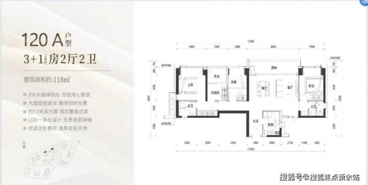 120㎡:客厅与卧室连通9.6㎡超大阳台,主卧带5.2㎡衣帽间,还有观景小阳台,主要为东南和西南朝向