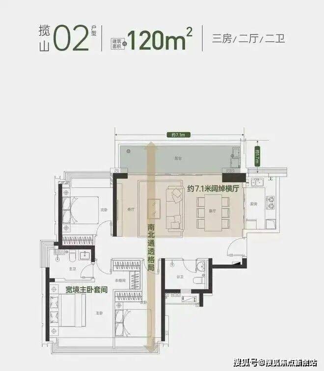 120㎡横厅户型看山,竖厅户型更靠近北环大道。横厅户型每一层有两个房源,客厅阳台和一个次卧朝东北,主卧、另一次卧及卫生间朝西南,客餐厨一体化+大阳台,视野上更加开阔。主卧借走隔壁次卧的一部分空间做成一个衣帽间。整体上动静分离,户型方正,视野开阔。