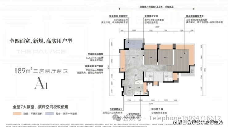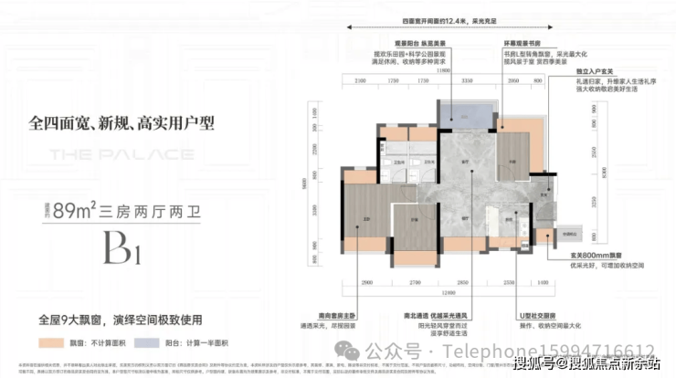 89㎡三房:竖厅LDKB一体化设计,270°采光客厅,主卧270°转角无柱飘窗,两个次卧面积相当,空间灵活多变。