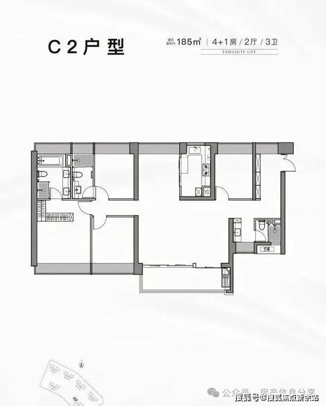 185平:5房2厅3卫,南北通透,使用率77.43%(不包含赠送)