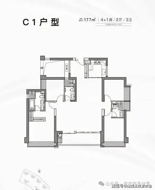 177平:5房2厅3卫,西南朝向,使用率77.43%(不包含赠送)