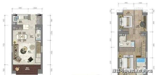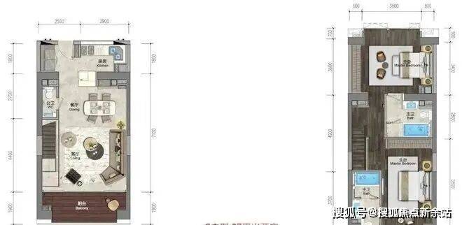 79㎡复式三房两厅三卫:南北通透,5.4米大开间,复式下层餐厨客厅连宽景阳台,另带一个法式小阳台。复式上层私密卧房全明采光,动静分区私享个性生活。另一个次卧带衣帽间。