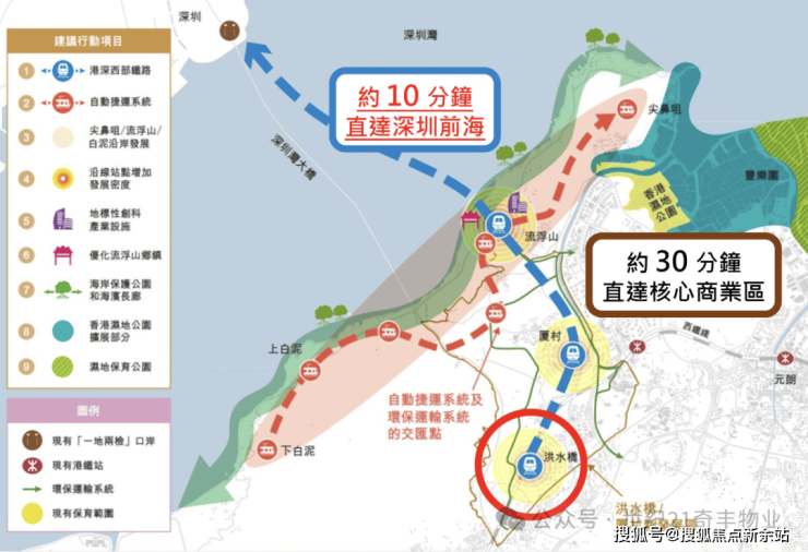 港深西部铁路由洪水桥站连接深圳前海,车程仅需10分钟,联繫两地交通枢纽,确立新发展区核心地位。