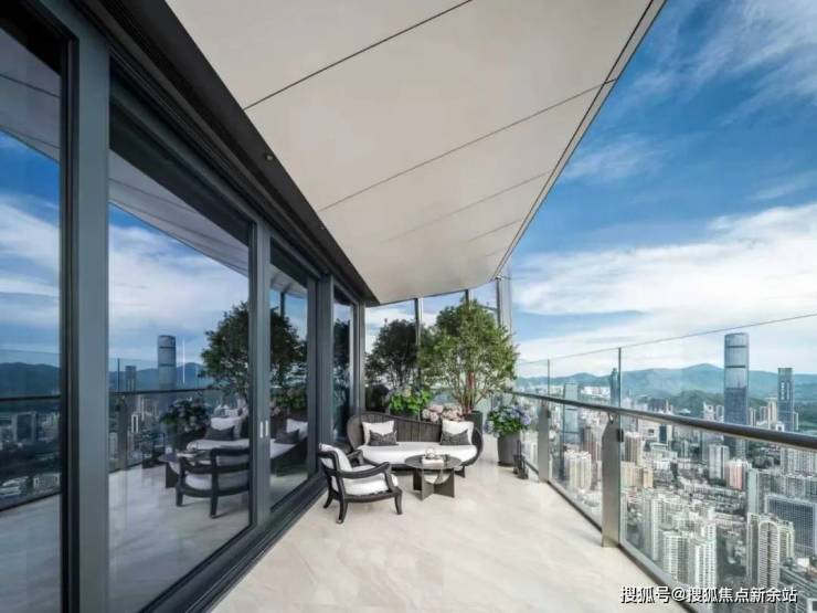 空间尺度革命:标准层高4.5米,净高介于3.1至3.3米之间,显著高于普通住宅2.8米的常规标准;350至1150平方米的大平层布局,配合LDKB一体化设计,增强空间流动感;每户均配置约40平方米的空中观景平台,搭配23米全景落地玻璃,实现室内外空间的自然过渡。
