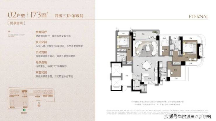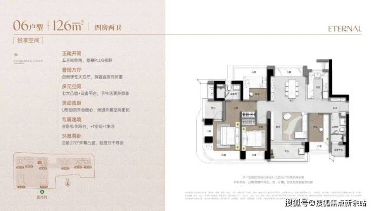 双电梯入户,双套房设计,有单独的家政间和设备平台,客餐厅一体,U型厨房设计可跟客餐厅连为一体,全屋多用飘窗作为赠送。