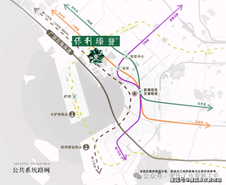 5地铁:距地铁11号线宝安站约800米,毗邻地铁1/5/11号线/15号线(首条“环形”地铁,建设中)/28号线(规划中);4城轨:深港西部快线 (已规划) 、深惠城际线(在建)、穗深城际线(在建)、深珠城际线(已规划);3高速:沿江高速、深中通道(在建)、深珠通道(已规划);2码头:大铲湾码头、妈湾客运码头;1枢纽:前海综合交通枢纽;