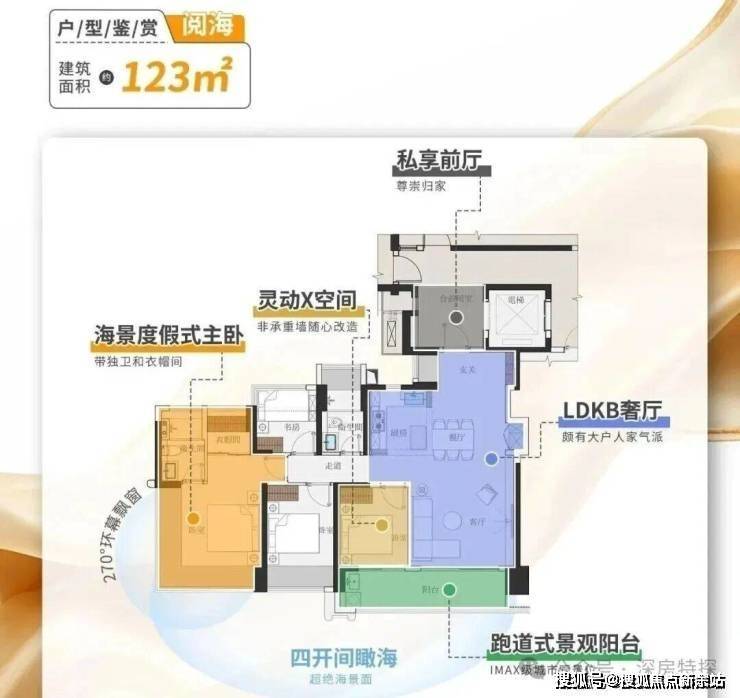 (2)约123㎡四房两卫(西南向户型),客厅朝向海景,景观面约17.8米,无遮挡。