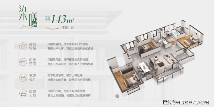 中间3F的143方平层,四房两卫的横厅,就是普通的平层产品,但胜在居住密度低和景观不错。