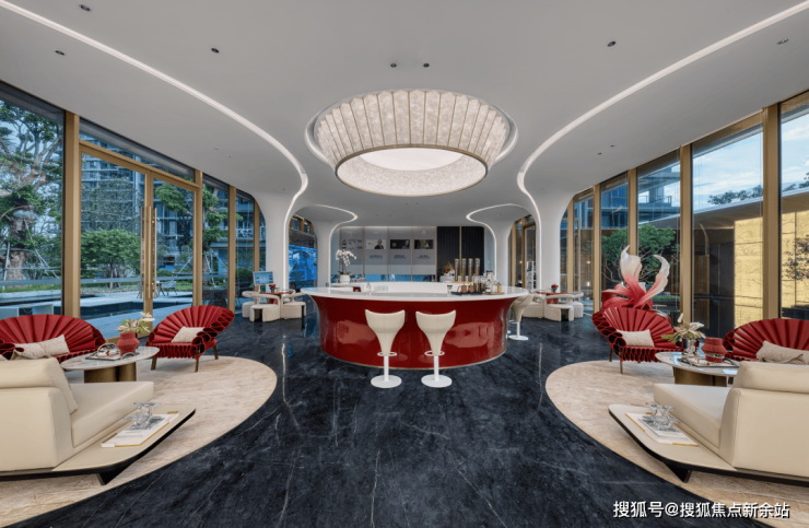 不仅如此,为了匹配高阶圈层需求,项目还不惜花费大成本邀请邱德光团队打造高定业主社交会所。该会所以中国红为点缀,提取传统灯笼形状元素,设计独具特色且充满文化韵味,只为 649 户业主特别定制。