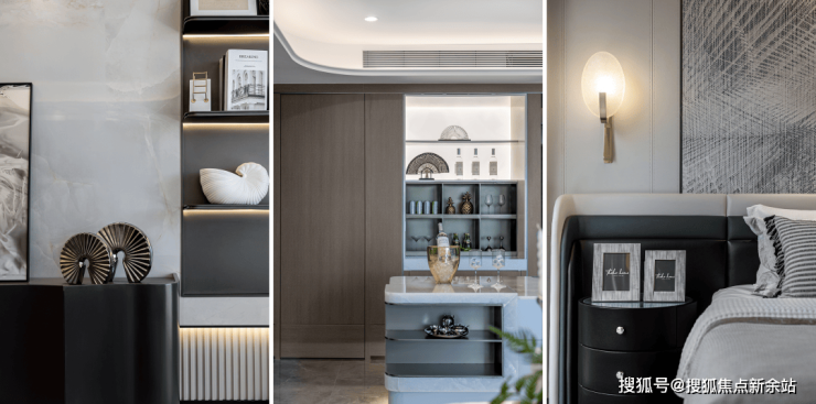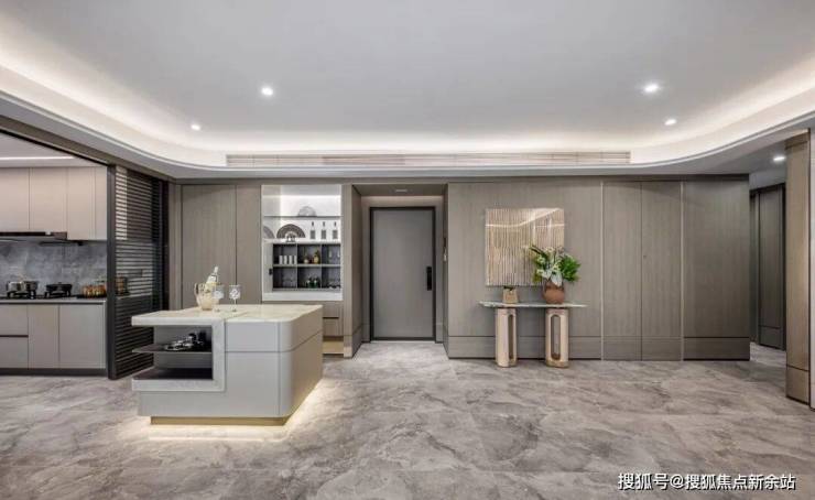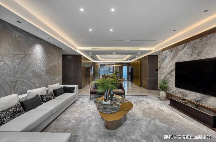 邱大师团队为此 首创了“雅致高奢”装修风格 ,他们融合海南在地元素,以棕咖、银灰为主色,金色点缀,还做了柔和的弧形吊顶,更显包容感和层次感。