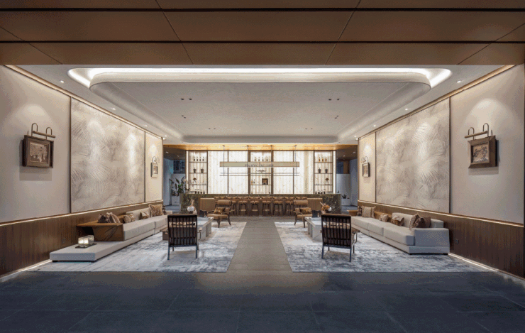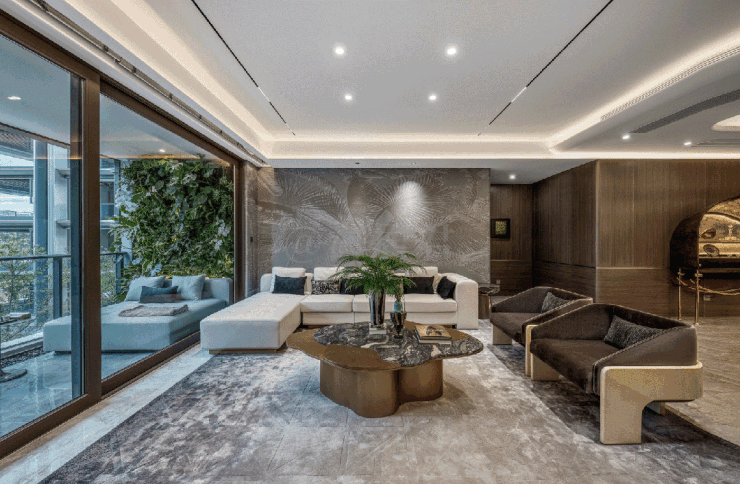 其气派大门令人过目难忘。约84米宽、约14米进深的入口前场,采用几乎全非标材质精心打造。整体以香槟金铝板铸就,搭配源自土耳其的透光石材背景墙,再点缀上迎客松,仅这一门头,便将极致匠心展露无遗,从踏入的第一步,就为业主开启尊崇不凡的归家之旅 。