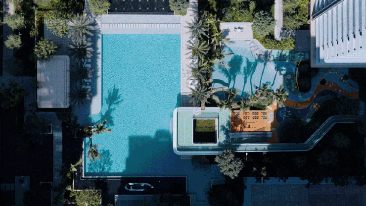 社区内部更是别有洞天。吉祥16号以曼谷四季酒店的水线绿洲为灵感,匠心打造约2000㎡的奢华级中央水域景观带。这里有三亚独一无二的立体式叠瀑,搭配分龄式露天泳池、吧台以及花园喷泉,彻底打破传统水景的单调格局,为业主带来灵动且丰富的视觉与休闲体验,无论是嬉戏畅游,还是静赏水景,都能在此找到惬意之所。