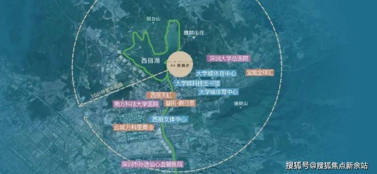 |天赋区位|湾区科创芯与湖山胜境|项目雄踞西丽湖国际科教城核心、大沙河生态走廊起源处,背靠留仙洞总部基地,毗邻西丽高铁站(规划中)与深圳北站双枢纽。这里不仅是深圳科创资源最密集的板块,更是“三山一湖四公园”自然格局的珍稀之地——麒麟山、羊台山、塘朗山三山环抱,西丽湖碧波荡漾,野生动物园、高尔夫俱乐部、大沙河绿道环绕四周,私享城市罕有的低密生态绿境。