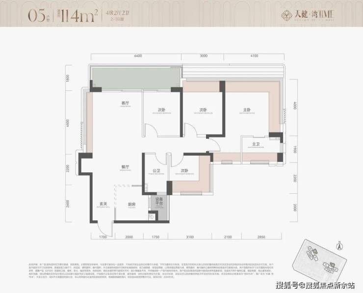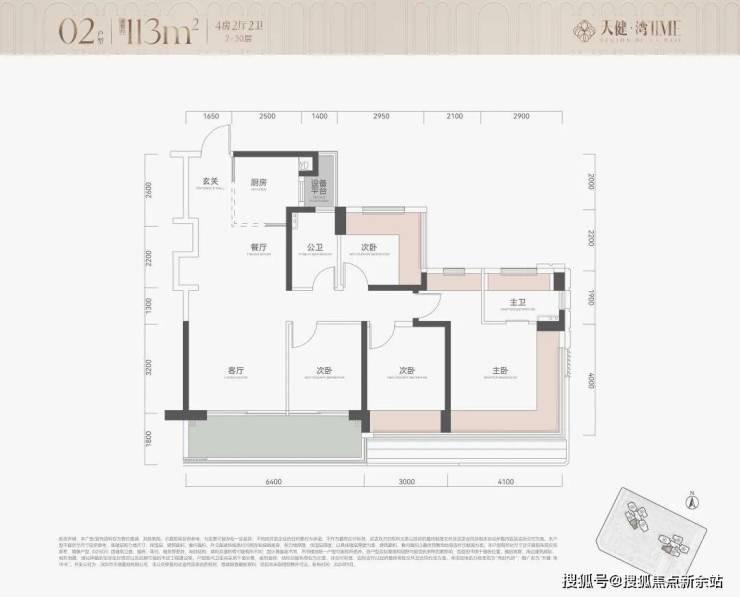 113㎡四房是项目的入门首选,采用竖厅设计,南北通透,6.4米宽大阳台连接客厅与次卧。户型动静分区明确,主卧带独立卫浴和飘窗,实际使用面积接近120㎡,空间利用率极高。