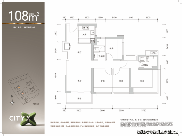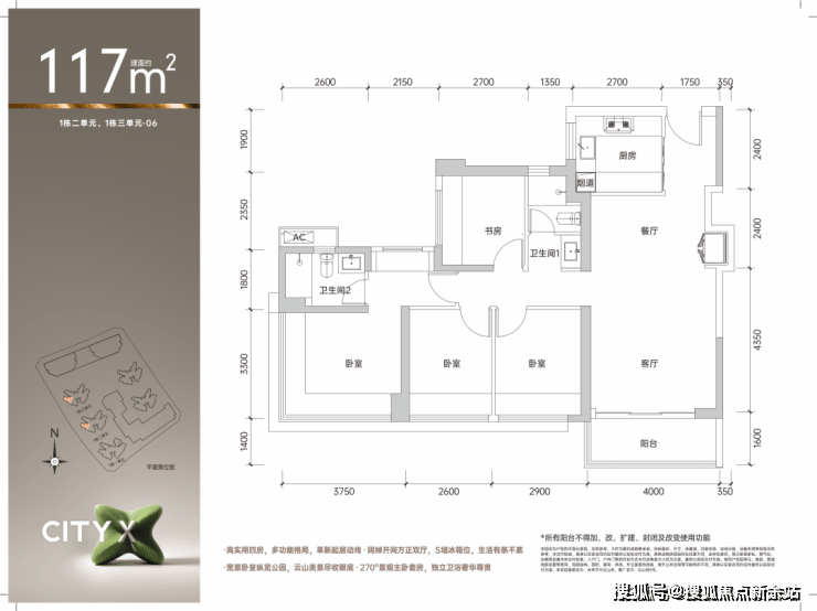 全明设计大景观视野,约3.6米开间宽活阳台;全南向客厅及卧室,主卧270°宽景采光