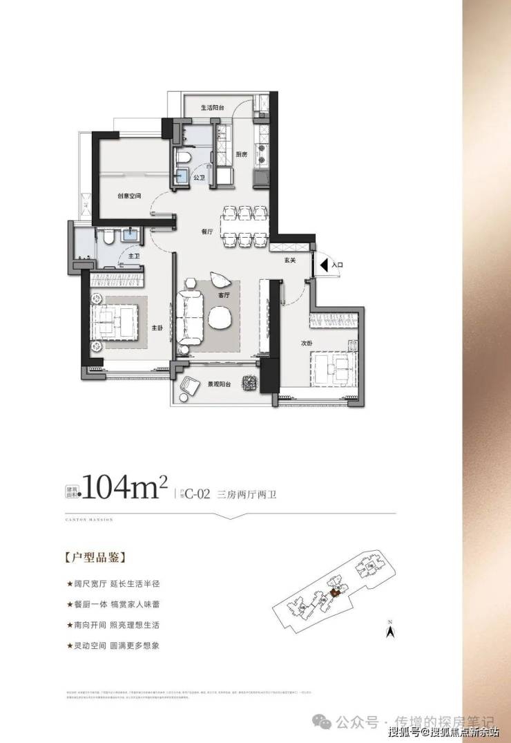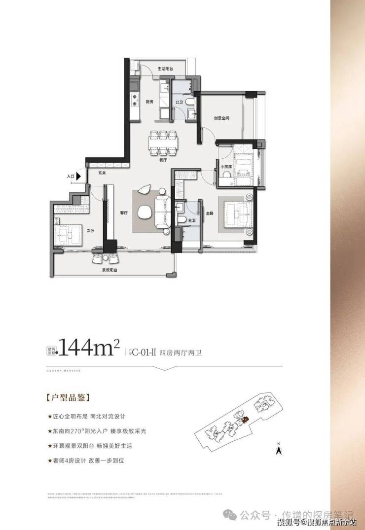 建面约111㎡三房两厅两卫精致3房设计,南北对流改善一步到位,东南向270°阳光入户,约4.2米景观阳台,约3.5米主卧开间 乐享144方主卧同等朗阔空间