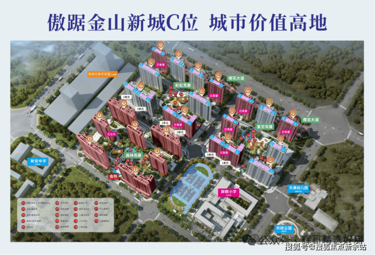 【2】区域:金山芯C位,最热门的板块&最核心的区域项目位于金山新城核芯C位,占据城市核芯地段,毗邻片区唯一7万㎡商业用地,紧邻约4万㎡城市绿地(规划),4万㎡体育公园(规划),36班公立小学群朗小学(已开学)一路之隔,紧邻高品质公立中学新安中心(已开学)。