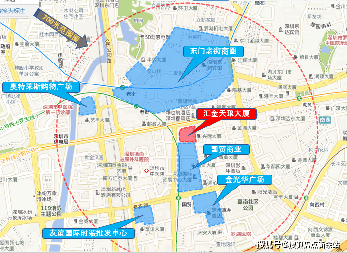 汇金天琅大厦位于罗湖金三角核心位置,坐落东门、宝安南、人民南三大商圈的衔接点。周边集中式购物中心和大厦集聚,比如地王大厦、万象城、金光华广场和茂业百货等,区域内商业繁荣,人气较旺;是罗湖非常重要的“金三角”商圈,也是深圳最大规模的商圈。