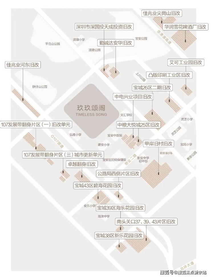 新安片区,尤其是在沿前进路正在进行着大规模的城市更新,分布着共20个旧改项目,超千万的旧改体量,相当于新安整个片区重建。仅我们项目2公里范围内就汇聚了8个旧改项目,分别是沃尔玛购物广场片区旧改、安华工业东区旧改,卓越翻身旧改、宝城碧海花园旧改、公路局西侧旧改、甲岸村旧改、宏发新领域、中洲中央公园二期。