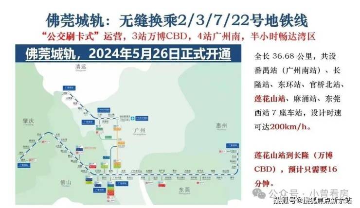 地铁交通:距离项目2.5公里处有莲花山站,佛莞肇城际已经开通运营了,3 站到长隆万博,4 站到广州南站。另外佛莞深城轨琶洲支线还在建设中,(2 站到大学城,3 站到琶洲)以及广中珠澳城轨(规划中)和8号线地铁的东延段(预计2027年通车)。