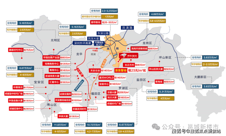 京东智谷三期所处的凤岗镇,地理位置得天独厚,堪称 “深圳里的凤岗”。周边交通网络纵横交错,高速公路、城市干道紧密相连。从园区出发,短时间内即可接入珠三角环线高速、武深高速等多条交通大动脉,快速抵达深圳、广州、惠州等周边城市核心区域,为企业的货物运输、商务出行提供了极大的便利。同时,公共交通也十分发达,多条公交线路在园区周边设有站点,与城市轨道交通的衔接也在逐步完善,员工出行选择多样且便捷,极大地提升了园区的交通便利性与可达性。