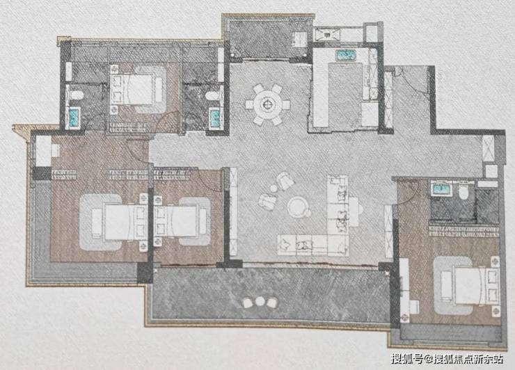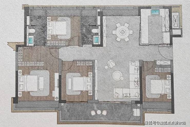 143㎡四房布局与128㎡大致相似,不同的是带南北双阳台。
