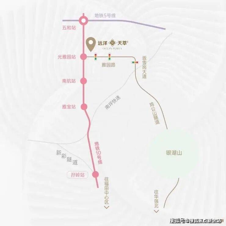 远洋集团打造,位于坂田街道五和大道与光雅园路交汇处东北侧,紧邻地铁10号线光雅园站B出口。总占地面积约1.36万㎡,共由4栋总高44-47层的住宅+1栋34层的办公组成:其中,1栋1、2单元为47层住宅,5单元为45层住宅,约615套住宅(含50套回迁房);1栋4单元为41层人才房,共180套人才房;1栋3单元为34层写字楼;2栋规划为3层幼儿园。