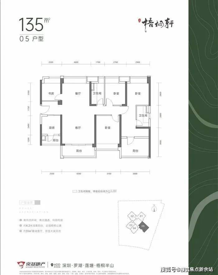 05户型建面约135㎡的5房2厅2卫,竖厅南北通透格局,客厅4.2米开间,客厅阳台主朝西南朝向。