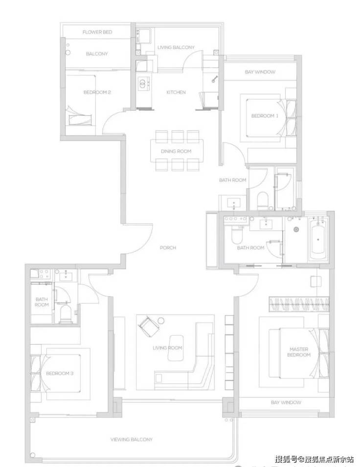 缦云广州产品面积段为145㎡三房两卫起步,面积低于主流顶豪项目面积(与其一路之隔的合景臻颐府面积段180-320㎡)。