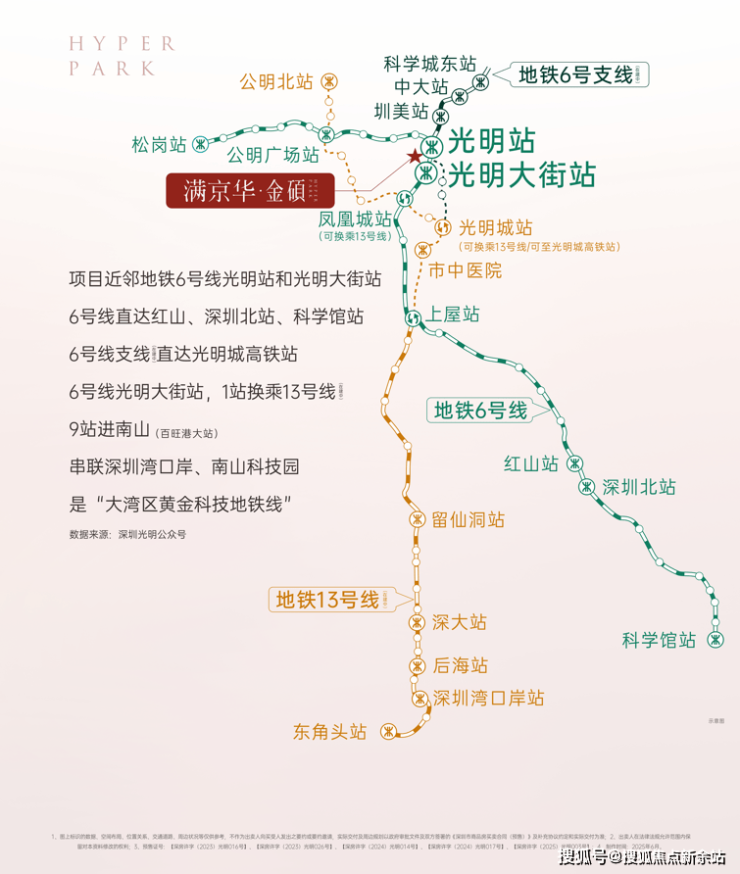 金硕臻府位于光明科学城"一心两区"的核芯承载区,也就是大家常说的中央居住区。项目北侧就是科学公园(南翼,在建中),向西约200米是在建的深圳外国语楼村第四学校,向南是光辉大道,地理位置相当核心。