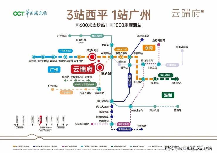 项目离规划中的 R1 地铁太步站、预计年底开通的广惠城轨麻涌站都不远。坐城轨 3 站到西平,1 站到广州莲花山,4 站到长隆,去穗莞深佛惠五个城市都很方便。