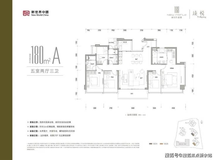 180㎡五房三卫:这是楼王户型,竖厅双龙抱珠格局,客厅5.5米开间,LDKB一体化设计,五开间朝南,约18.6米巨幕面宽。双主卧套间设计,主卧达到30.5㎡,非常奢适。U型厨房,公卫带生活阳台约3.89㎡,阳台约10.73㎡。西南朝向,少量稀缺房源