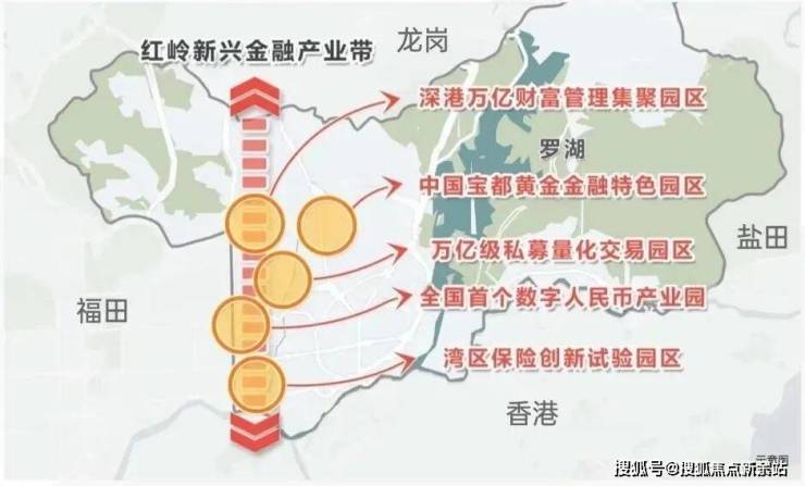 大湾区金融极:其中红岭新兴金融产业带作为"深圳三大金融增长极”之一,与前海国际金融城、福田香蜜湖金融街并列,罗湖将先天的金融优势及政府的政策支持,以金融产业赋能罗湖新发展,助力深圳成为大湾区经济发展引擎。( 信息来源:罗湖发布)