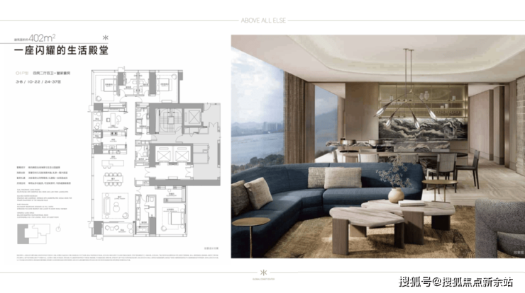 户型设计延续奢居尺度与视野优势:低区约303–327–402㎡,高区约402–568–1032㎡,层高约3.6–4.5米,均通燃气并配超大阳台。部分户型以270°环幕视野,将自然光与五重景观引入室内,成就“景中有居、居中有景”的沉浸式栖居感受。