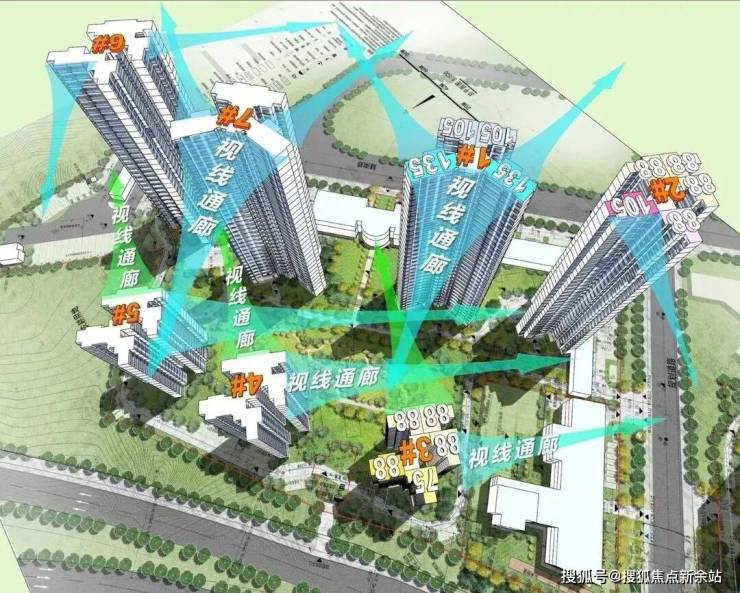 其一,散点式排布,每栋楼都是独立的,楼栋左右有三四十米的间隔,最大化提高了楼栋两侧单边位的采光面和视距。