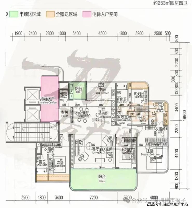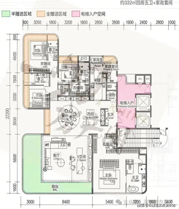 253-332㎡四房四卫:顶豪配置,3套间+西厨,主要在2、3、5栋的楼王位置。南向面宽能达到18-20米,采光通风极佳,专梯入户,主卧带超大衣帽间和双台盆+浴缸,完全是塔尖人群的配置。332㎡的户型还带家政套间,细节拉满,预计总价会超过4500万