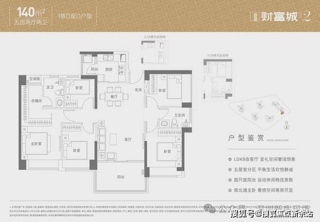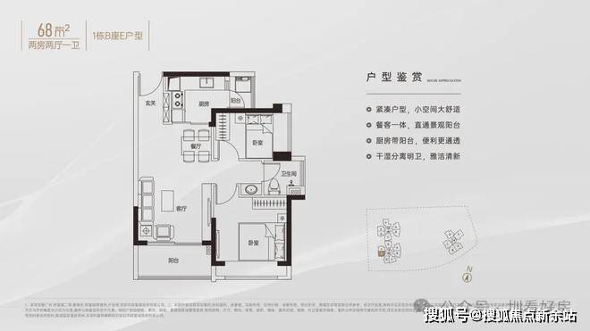 竖厅格局,客厅3.4米开间,LDKB一体化设计,动静分区,L型厨房还带1个生活阳台,卫生间三段式干湿分离,得房率约79%(不含赠送),东北朝向。