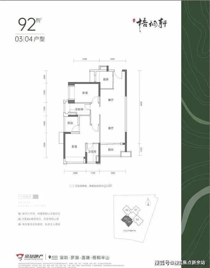 03\04户型92㎡3房2厅2卫,竖厅格局,客厅3.4米开间,西南朝向。