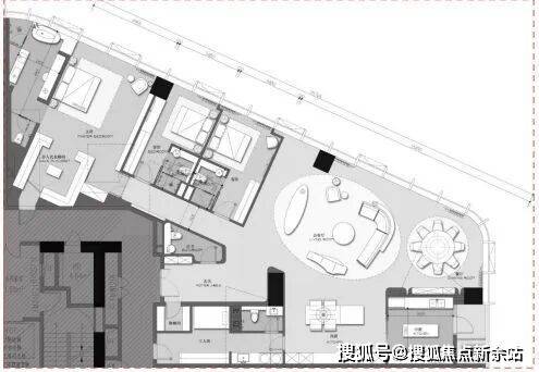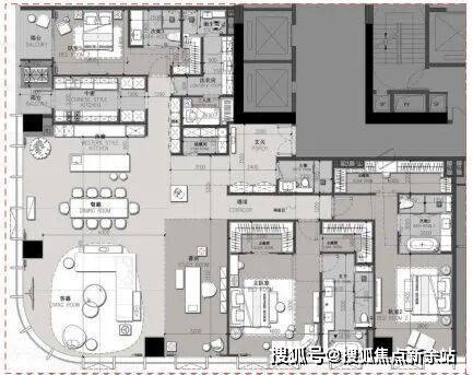 建筑面积约 439㎡,为 3 + 1 房 2 厅 2 厨 5 卫布局。该户型由 LSD 亲自操刀设计,拥有 270°城市与绿化景观,高区可看海景。采用全套房、双主卧设计,客餐厅开间超 10 米,方正主卧面积达 24㎡且为明卫设计,次卧带阳台,中西厨结合,还有多功能房,空间灵活多变。