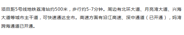 项目一路之隔规划36班小学(暂定名:荔山小学),周边多所幼儿园、小学及初高中,如荔湾小学、深大附中初中部和高中部。深大附中即深圳大学附属中学,是深圳市政府投资建设、市教育局领导、深圳大学管理的市直属公办重点中学,是广东省一级学校、广东省国家级示范性普通高中。国际学校方面,项目约2公里范围内有荟同国际学校、哈罗港人子弟学校、国王学校、南山中英文学校、SIS太子湾校区、深圳贝赛思国际学校等多个国际学校。