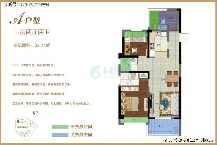 2# 楼在售户型:B 户型 85.36㎡两房两厅两卫;A 型 87.71㎡三房两厅。